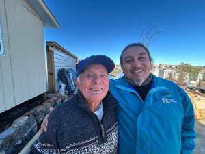 Luis Cifuentes junto al jefe del servicio de atención domiciliaria para personas mayores, de la cual es parte desde hace años. Agradecido, Luis manda a comprar bebidas para las visitas y no para de dar las gracias.