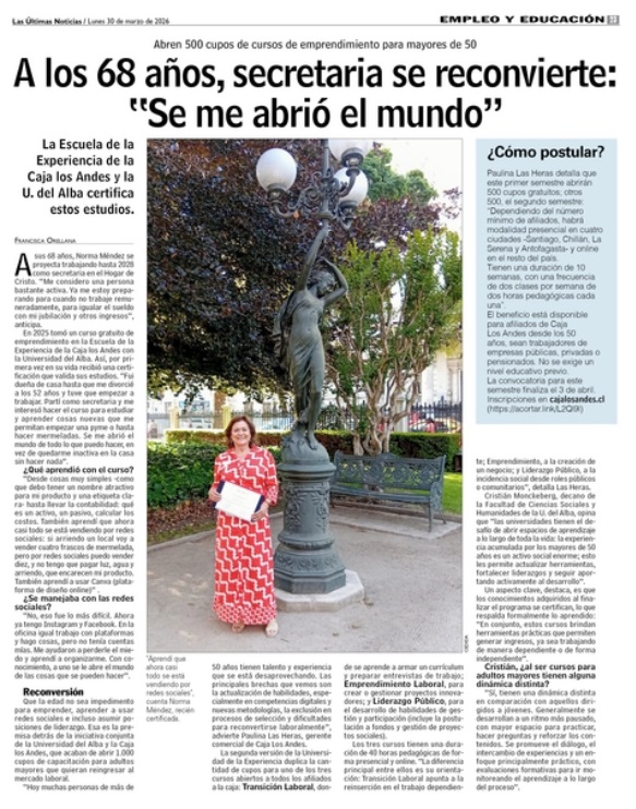 La iniciativa —impulsada por la Universidad del Alba y Caja Los Andes— busca demostrar que la edad no es impedimento para aprender, emprender o asumir nuevos desafíos. Actualmente, han abierto 1.000 cupos de capacitación para personas mayores interesadas en reinsertarse en el mundo laboral.