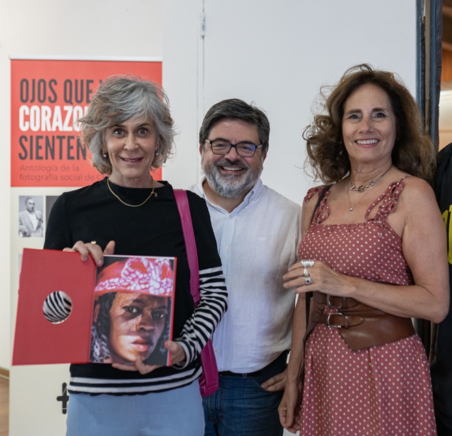 La fotógrafa Ximena Hinzpeter, Patricio de la Paz y Ximena Torres Cautivo, editora y creadora de la antología “Ojos que ven, corazones que sienten”, durante el lanzamiento del libro.