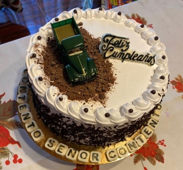 Contento, Señor, contento, es la máxima que adoptó Heriberto Salinas en su visa. Estaba hasta en sus tortas de cumpleaños, como ésta con la que celebró sus 98 años. La camioneta verde es otro gran detalle.
